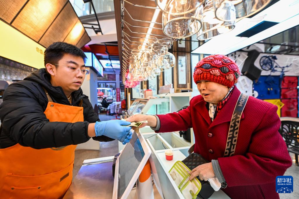 11月25日,市民在天津市河西区“美丽的菜市场”一处冰淇淋档口付钱购物。
