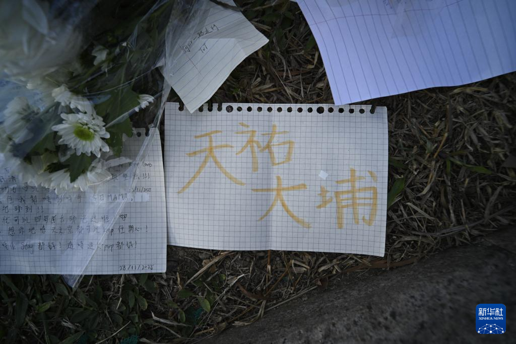 这是11月29日清晨在火灾后的大埔宏福苑楼宇附近拍摄的市民摆放的寄托哀思的花束、留言条等物品。