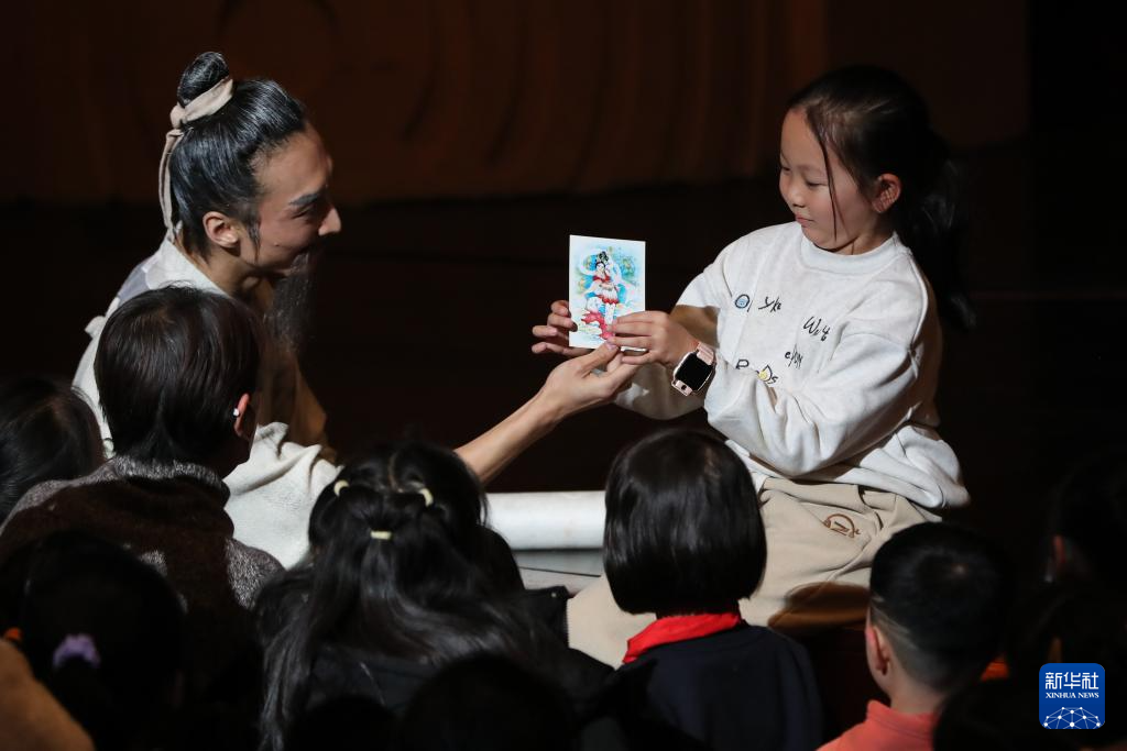 11月28日晚,演员在中场休息间隙与台下观众互动并赠送《丝路花雨》明信片。