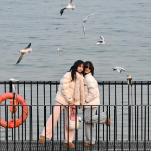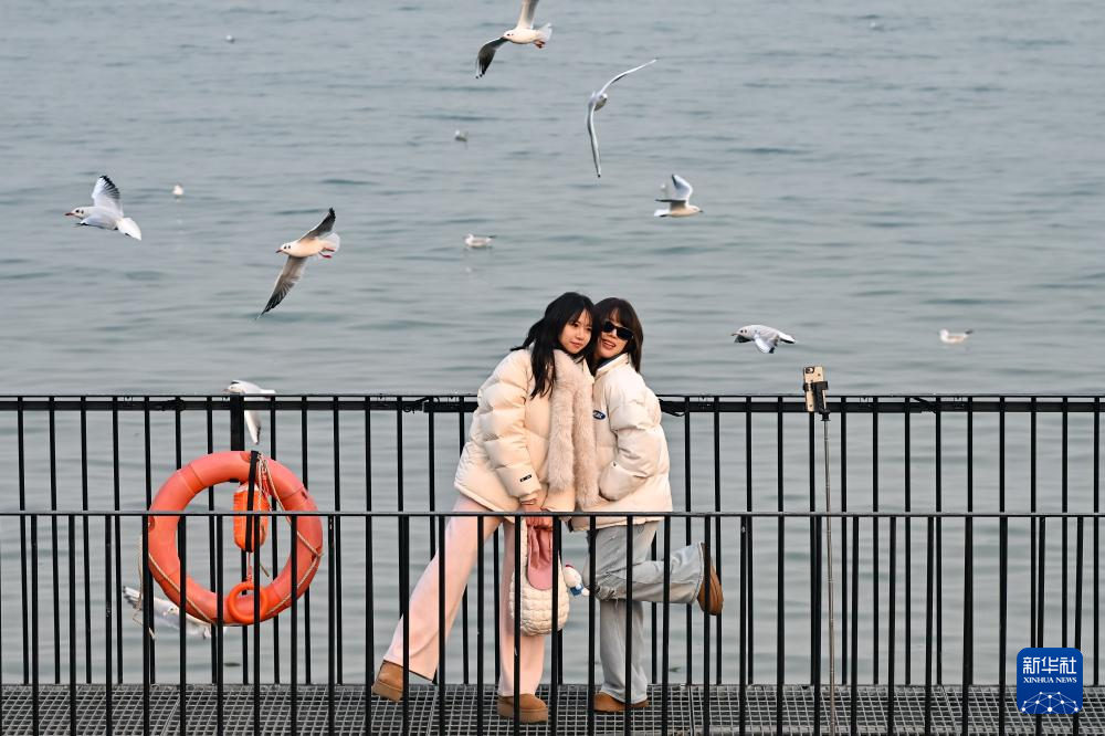 冬日,在天津市滨海新区的海贝乐园,成群的海鸥在此聚集栖息,吸引众多游人前来喂食、赏趣。