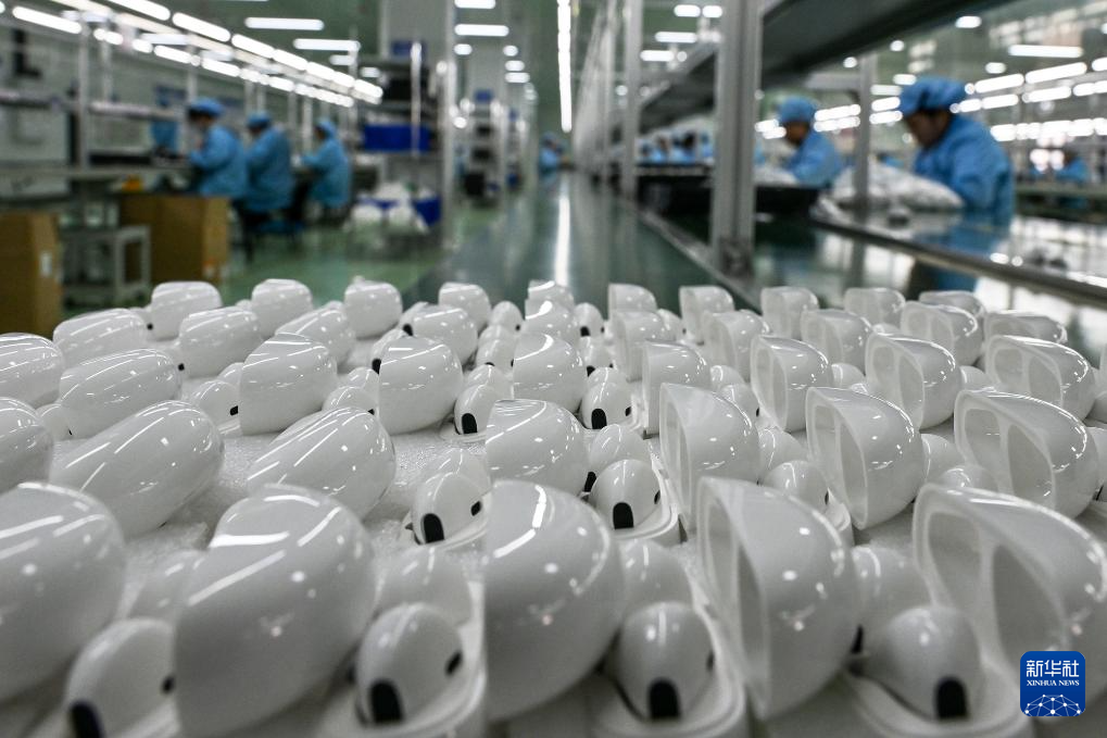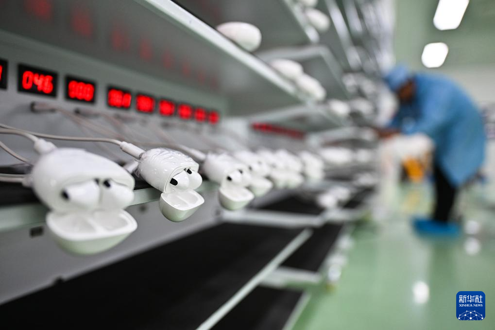 12月11日,在河南省商丘市梁园区商丘集美数智产业园,工人在蓝牙耳机生产线上赶制一批出口海外的订单。