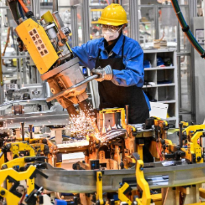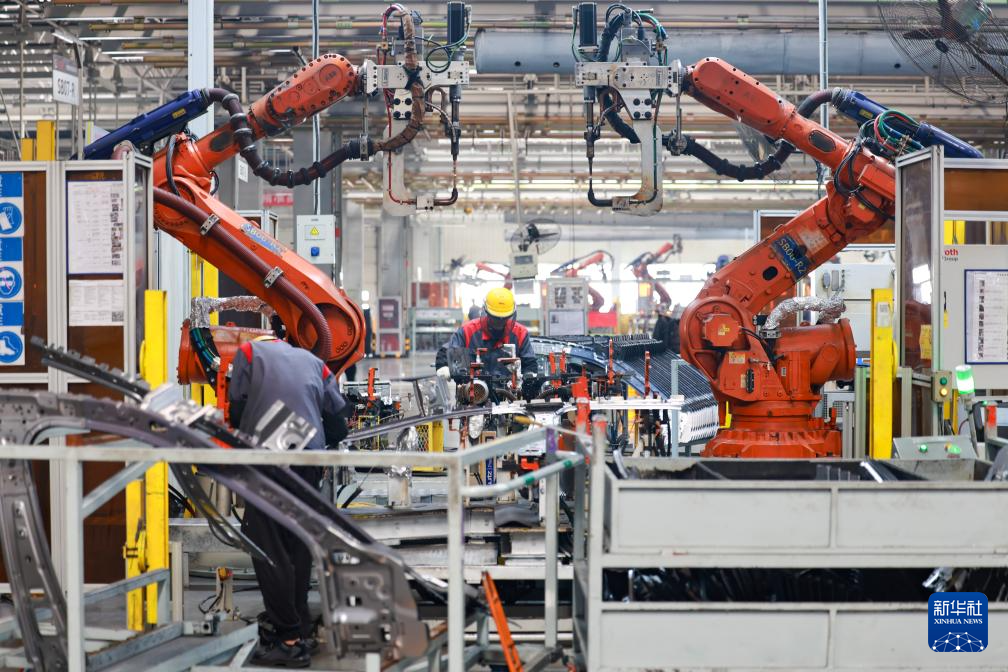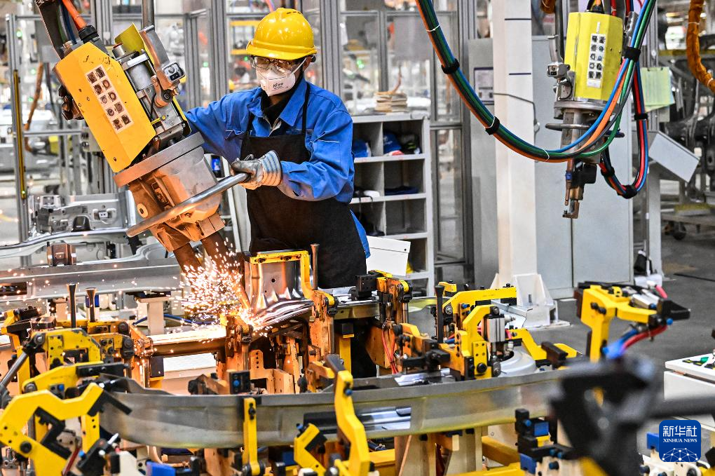 12月12日,在江苏省泰州市,长城汽车股份有限公司泰州分公司工人与机械臂协调配合,开展焊接作业。