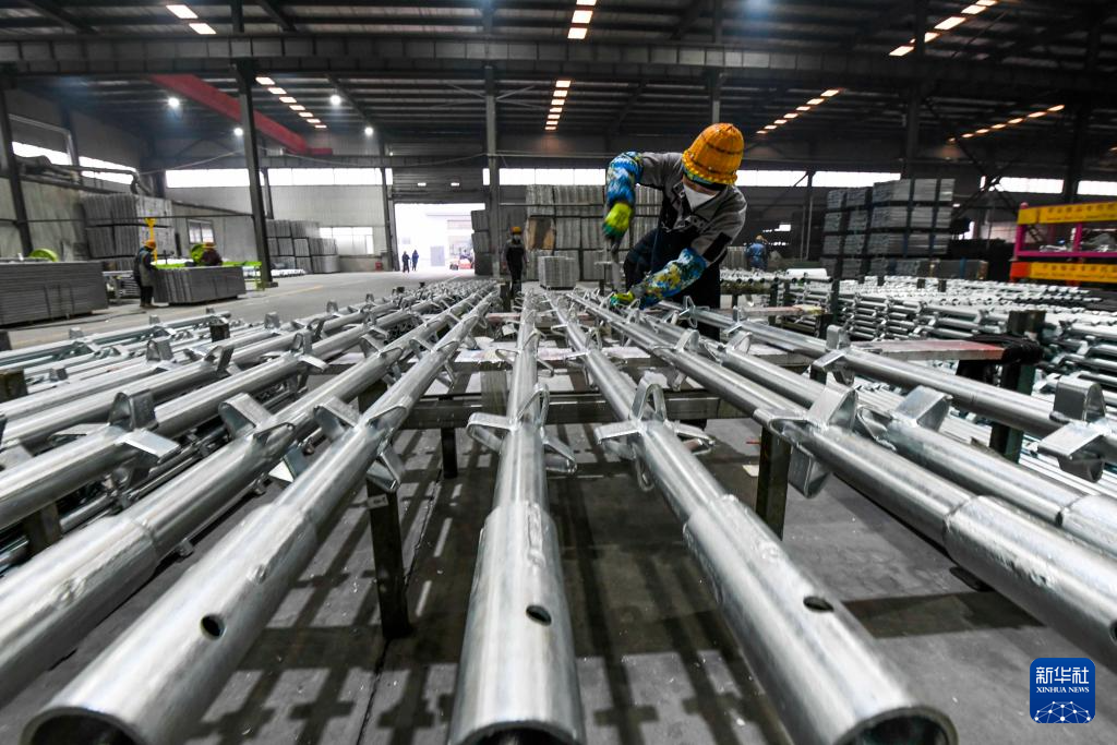 12月12日,工人在河北省唐山市乐亭县经济开发区的一家脚手架生产企业车间工作。
