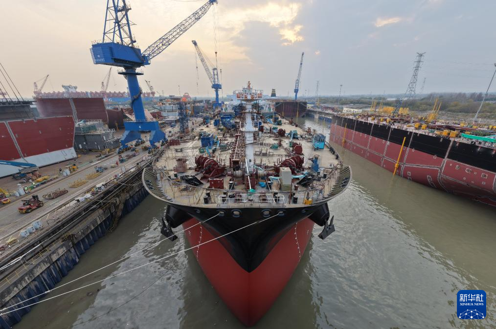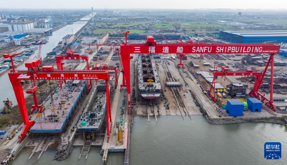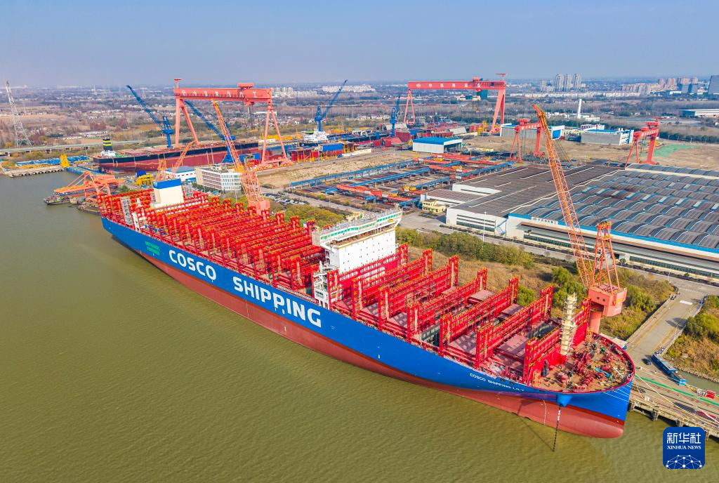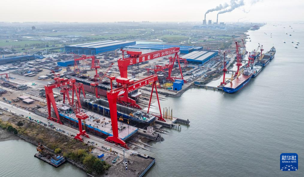 12月10日,在江苏省扬州市江都区扬州中远海运重工有限公司生产厂区,大型船舶正在建造中(无人机照片)。