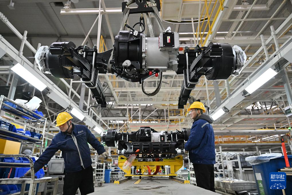 12月12日,在河南省商丘市豫商经济技术开发区一家新能源汽车企业,工人在新能源轻卡车生产线上赶制产品订单。