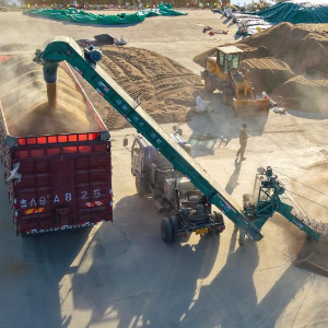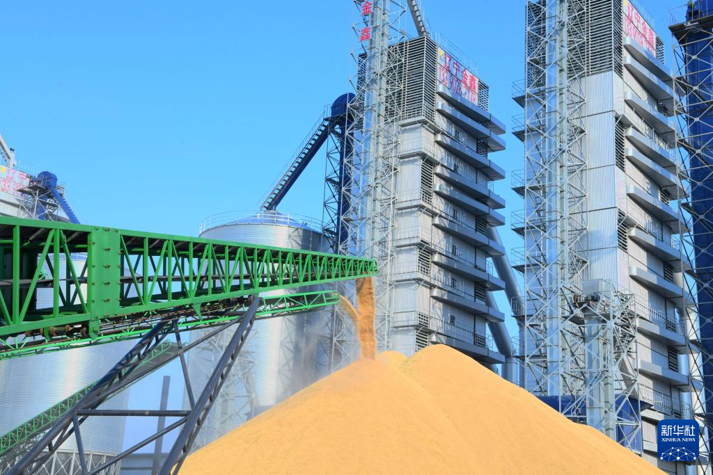 11月12日,在黑龙江汤原鹤立国家粮食储备库有限责任公司内,输送机在输送粮食。
