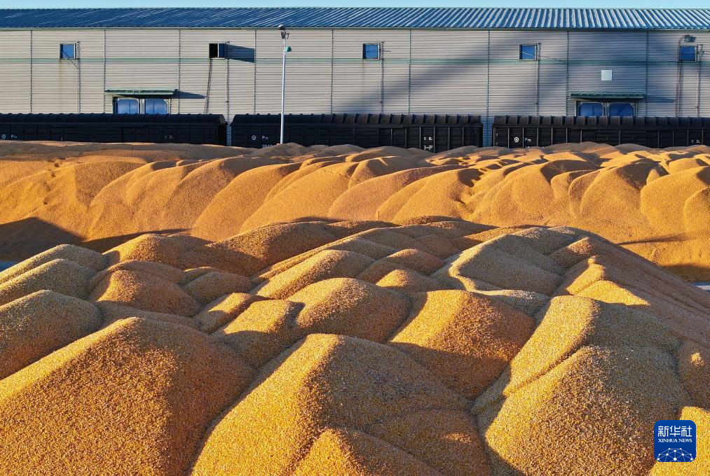 10月14日在北大荒集团北安分公司龙镇农场有限公司粮食烘干合作点拍摄的待烘干的玉米(无人机照片)。