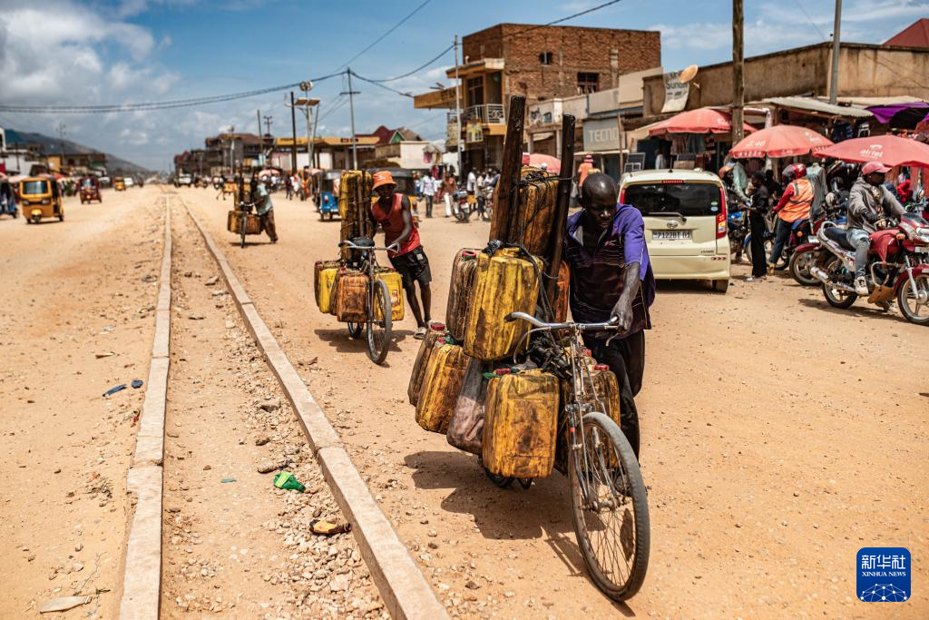 12月15日,在刚果(金)东部城市乌维拉,当地居民用自行车搬运汽油。