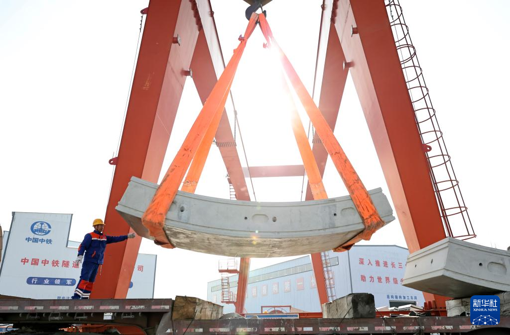 12月16日,工人在崇太长江隧道项目施工现场辅助吊车吊装隧道管片。