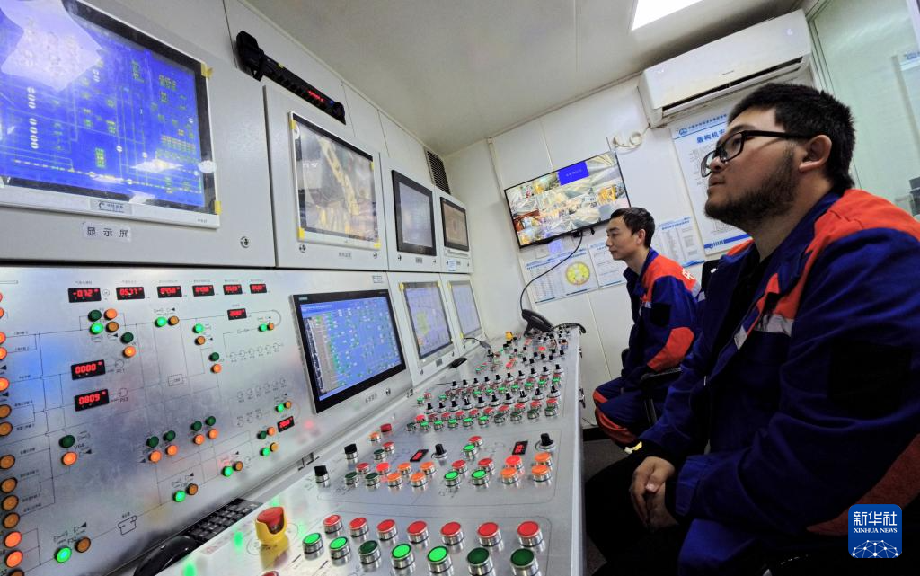 12月16日,工人在“领航号”盾构机控制室内监看掘进运行数据。