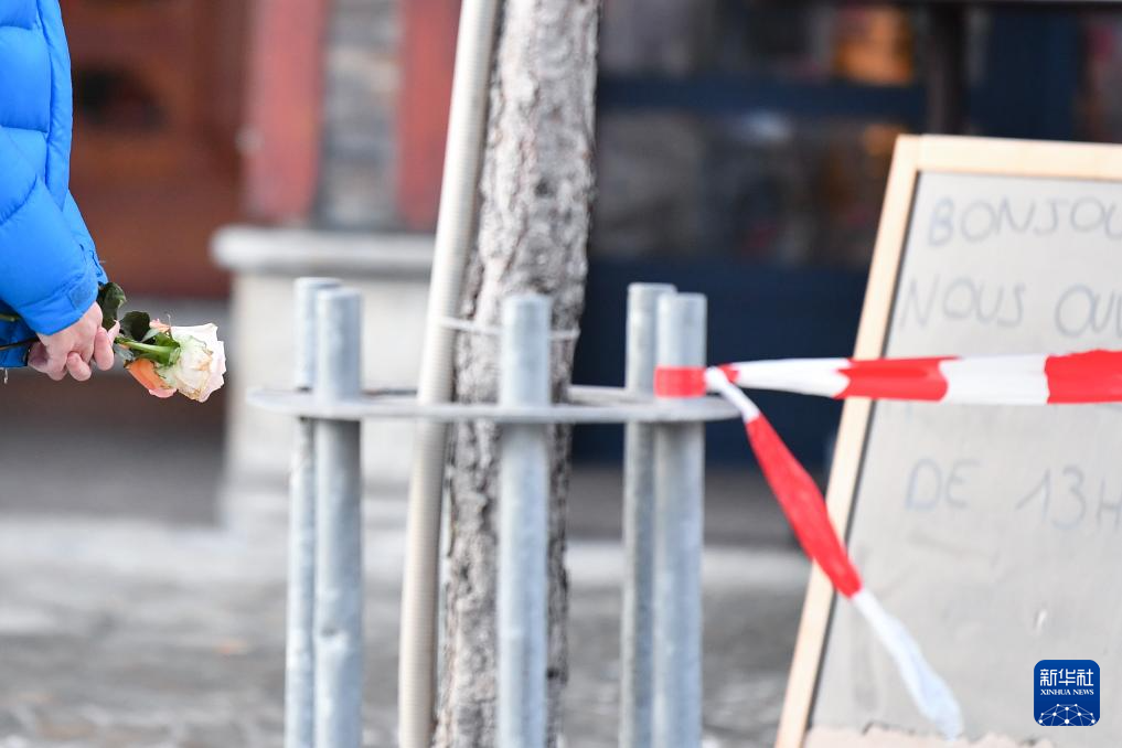 1月1日,在瑞士克朗-蒙大拿,当地民众在发生火灾的酒吧附近区域手持鲜花哀悼。