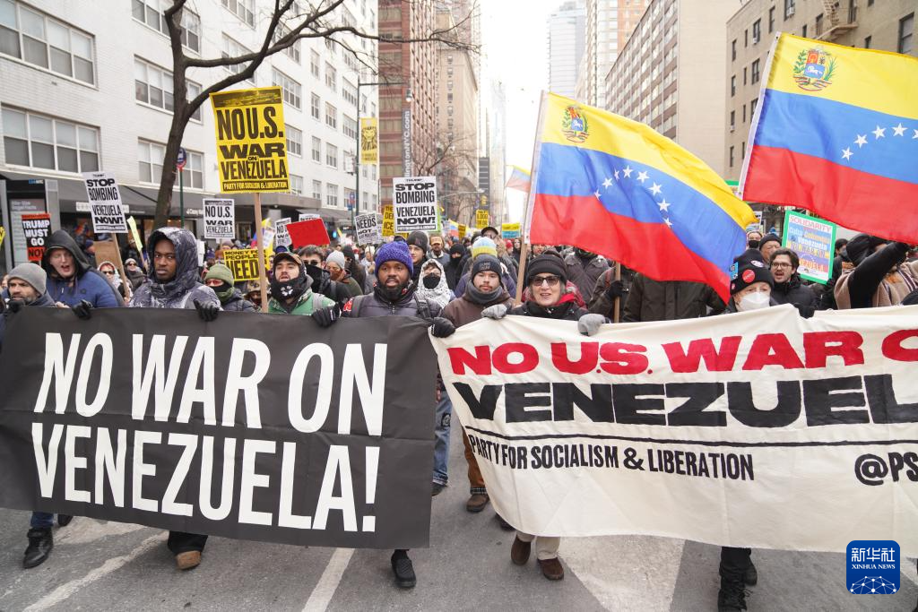 当日,近千名民众在美国纽约举行集会游行,抗议美国对委内瑞拉实施军事打击。