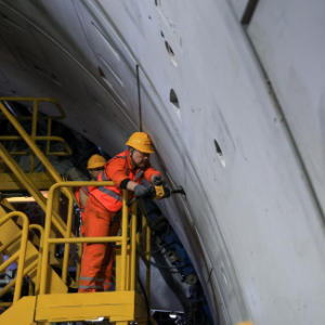 1月6日,中铁十四局施工人员在“深江1号”盾构机上进行管片螺栓紧固工作。