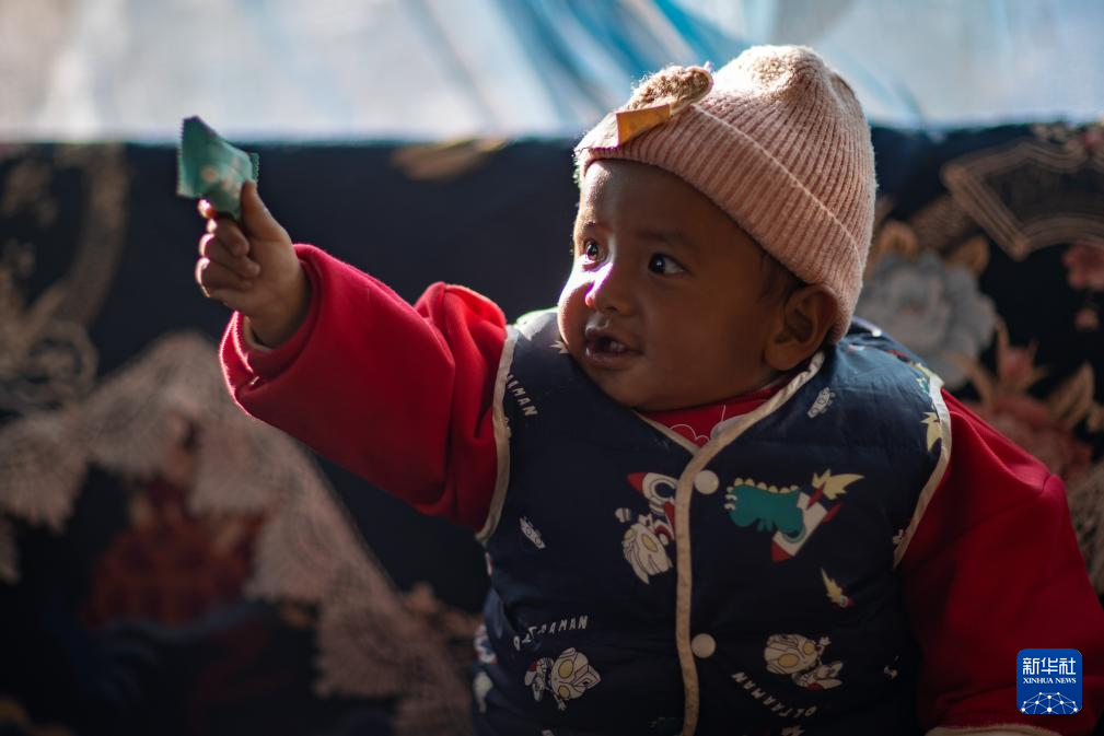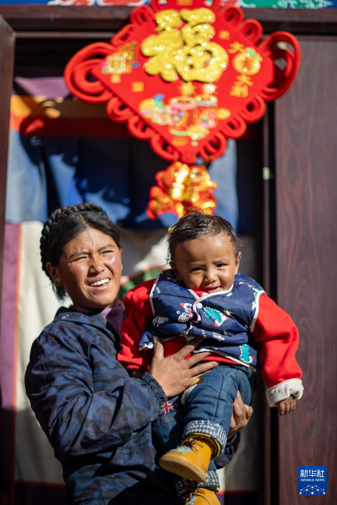 1月5日,在西藏定日县长所乡杂村,母亲朋琼在家中逗弄次仁拉巴。