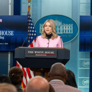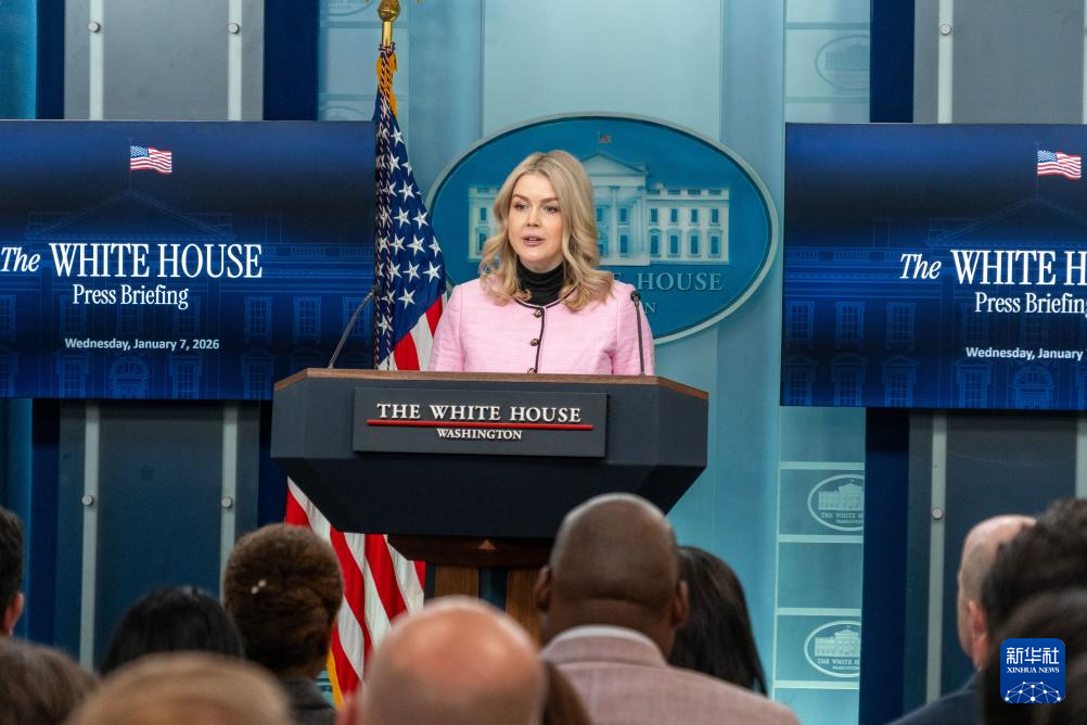 1月7日,在美国首都华盛顿白宫,白宫新闻秘书莱维特出席记者会。