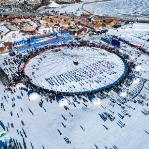 1月8日,在吉林省松原市,人们参加吉林·查干湖第24届冰雪渔猎文化旅游节开幕式(无人机照片)。