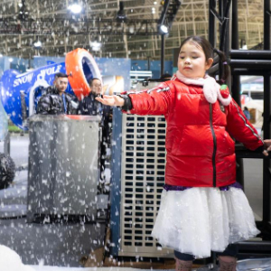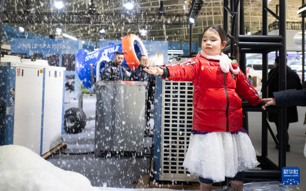 1月6日,在2026哈尔滨国际冰雪经济博览会冰雪装备展区,小朋友触摸制雪机现场制造的雪花。