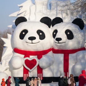 1月8日,游客在太阳岛雪博会巨型大熊猫雪雕前留影。