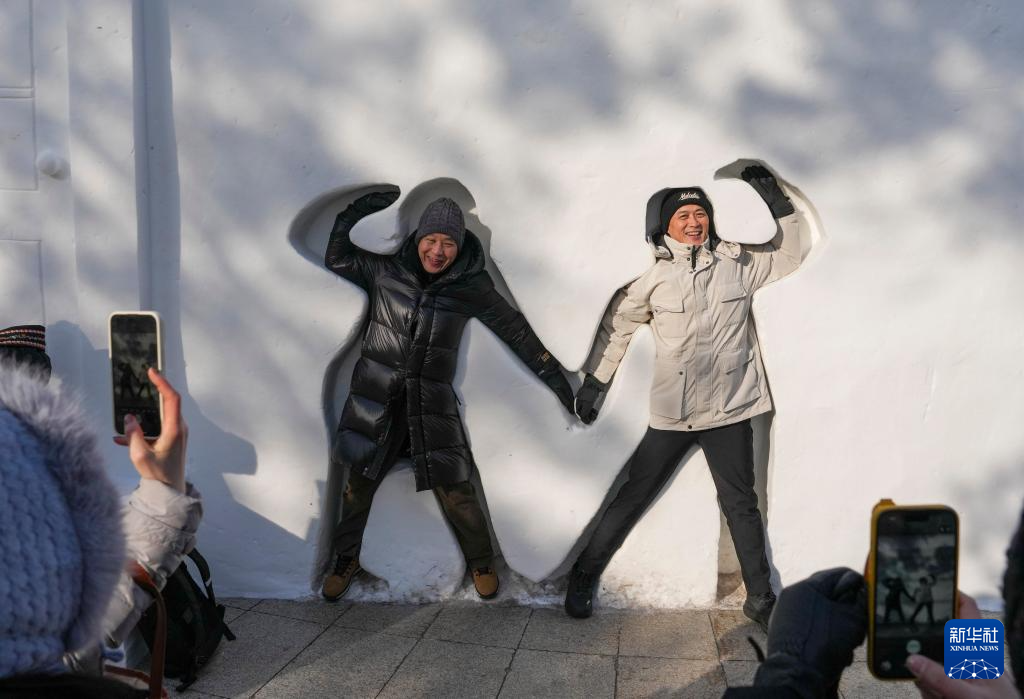 1月6日,游客在太阳岛雪博会园区游玩拍照。