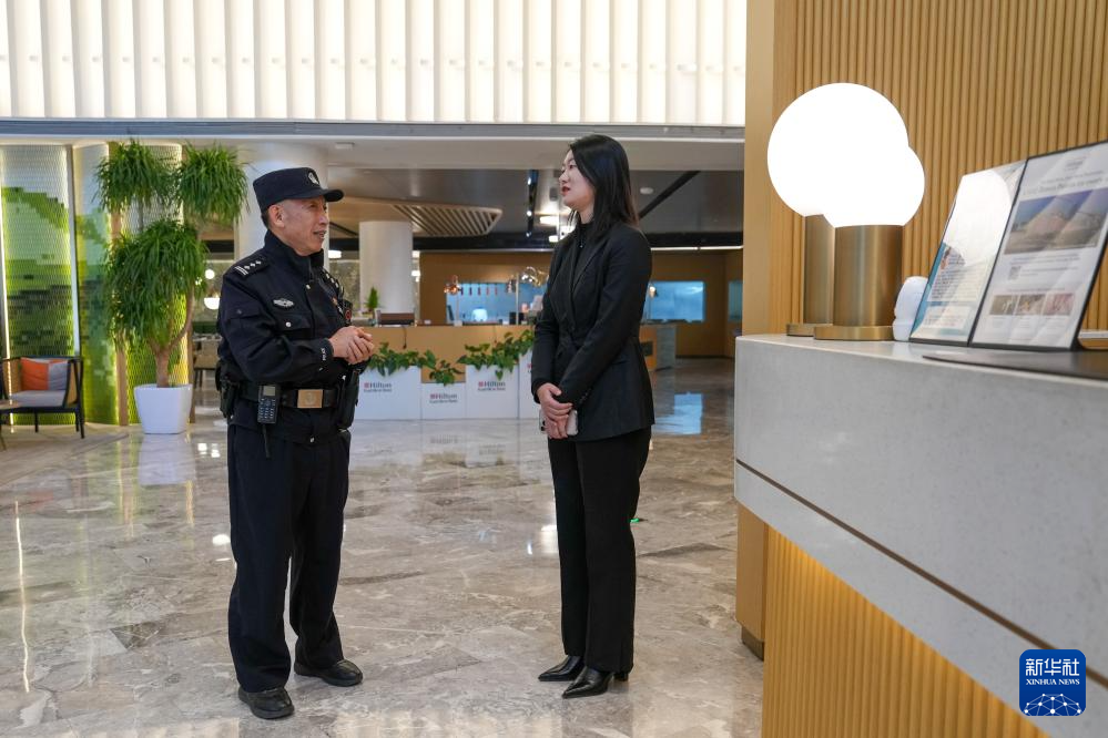 1月8日,民警赵阳(左)在辖区内一家酒店与相关负责人沟通,准备进行安全宣传活动。