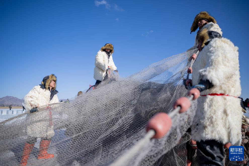 1月10日,渔民把网从冰面下拉出。