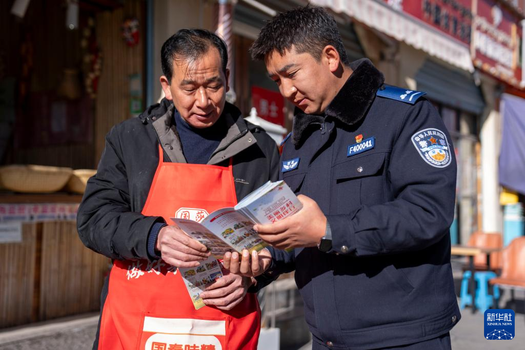 1月8日,金盾苑警务站民警刘洋(左一)和同事在拉萨高新区进行普法宣传。