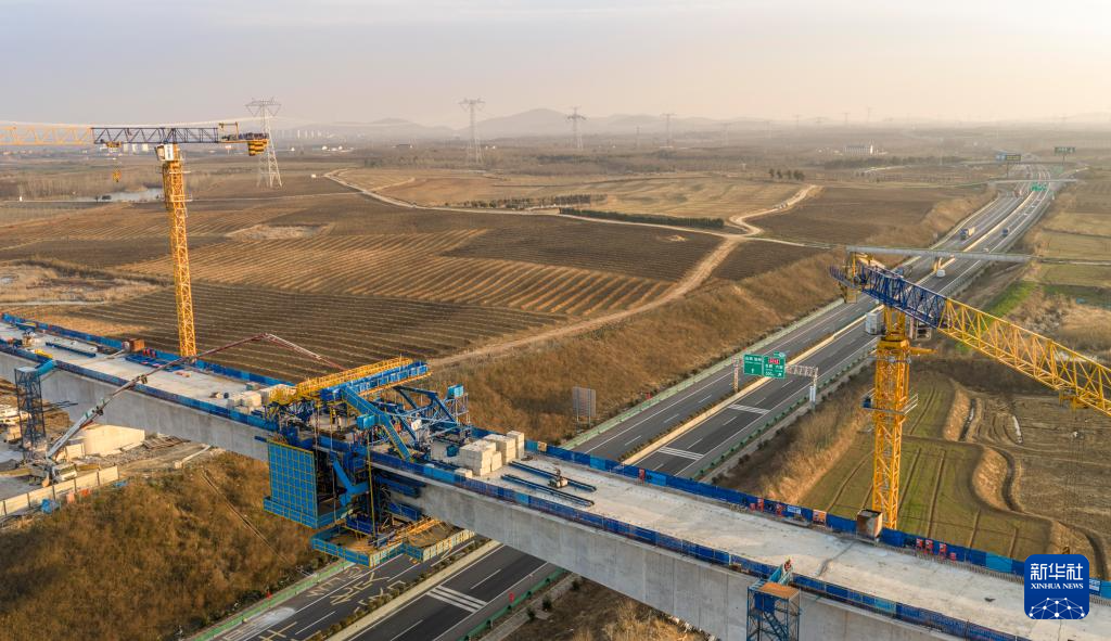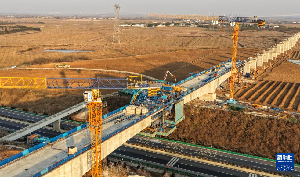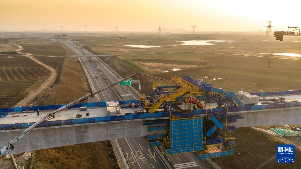 这是进行合龙施工的合武高铁庐安特大桥跨德上高速连续梁(1月12日摄,无人机照片)。