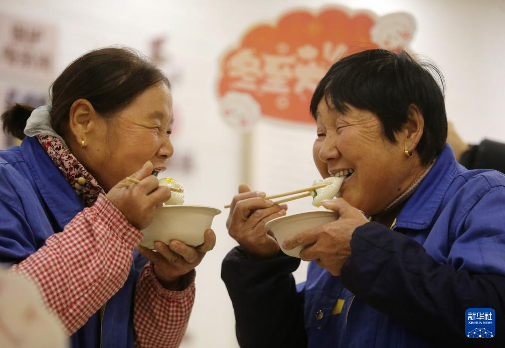 2025年12月21日是冬至,在江苏省扬州市鸿福社区圆梦义工志愿者服务站,环卫工人在爱心活动上吃汤圆。