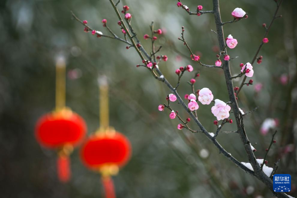 2025年12月31日在湖北省襄阳市保康县清溪河景观公园拍摄的雪中梅花。