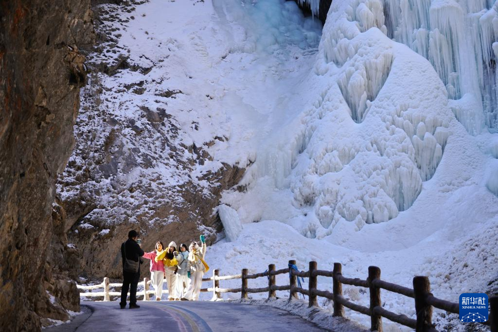 2026年1月9日,游客在甘肃省宕昌县官鹅沟景区的冰瀑前合影留念。