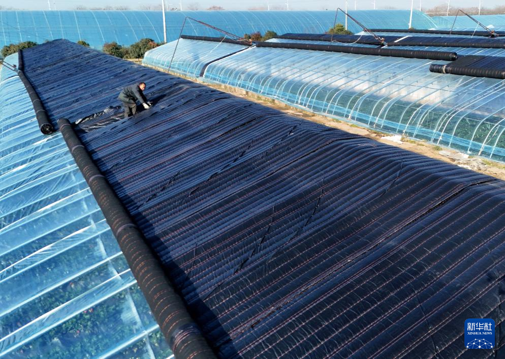 2026年1月7日,河南省南阳市社旗县李店镇一家蔬菜种植基地工作人员为蔬菜大棚铺设保暖设备御寒(无人机照片)。