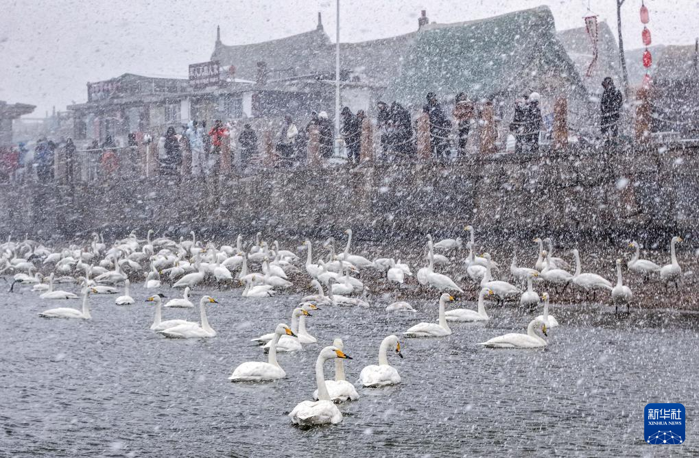 2026年1月10日,在山东省荣成市俚岛镇烟墩角村,游客冒雪观赏大天鹅(无人机照片)。