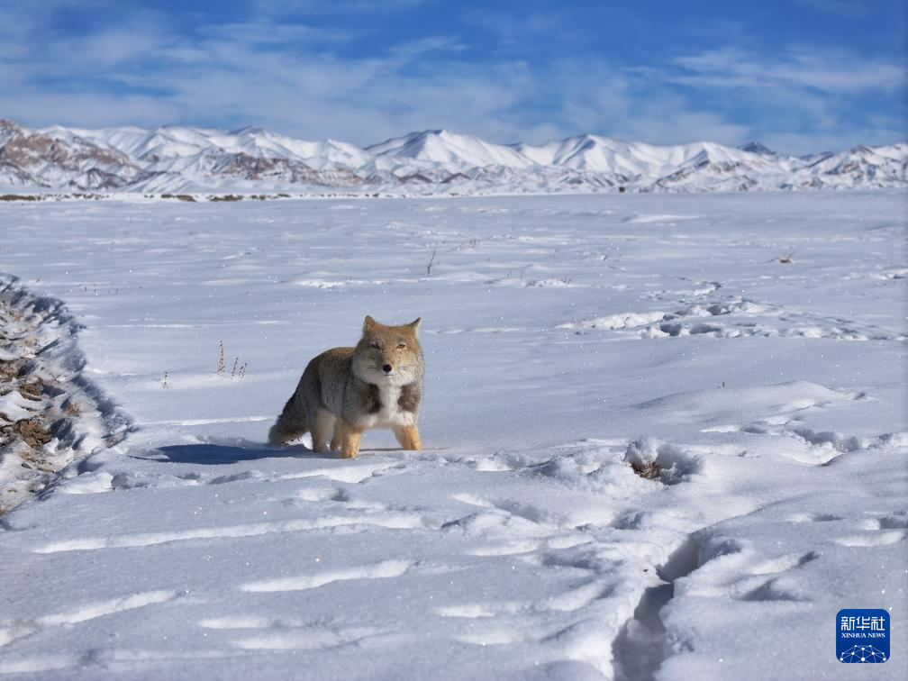 2025年12月31日,在甘肃省酒泉市阿克塞哈萨克族自治县阿勒腾乡,一只藏狐在白雪覆盖的草原上活动(无人机照片)。