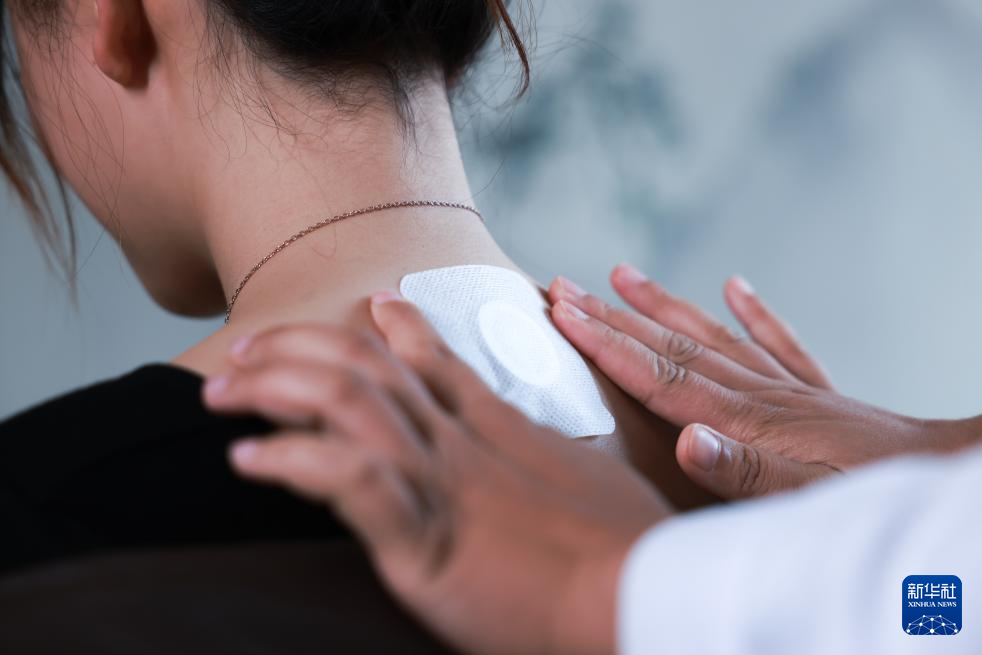 2026年1月12日,在云南省红河哈尼族彝族自治州开远市中医医院,医生为一名患者贴“三九贴”。