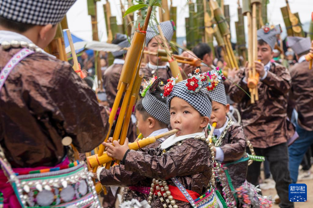 2025年12月21日是冬至,苗族小朋友在贵州省从江县丙妹镇大洞村的芦笙节上吹奏芦笙。
