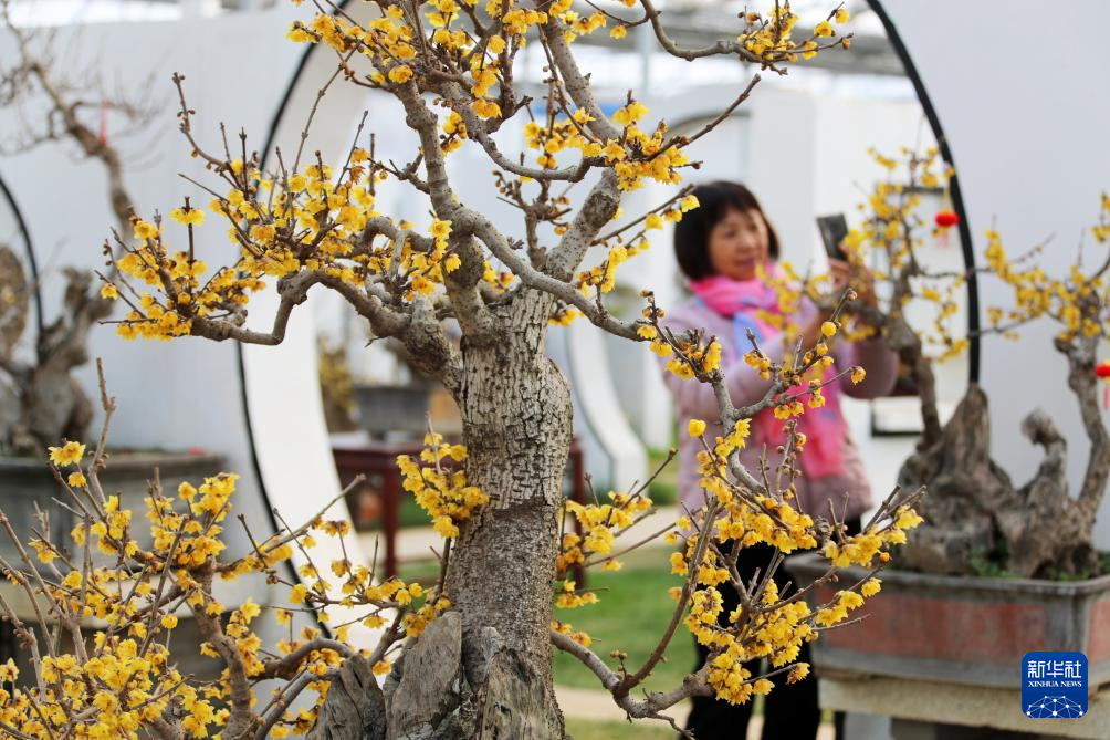 2026年1月1日,游客在河南省许昌市鄢陵县新科梅园观赏蜡梅。