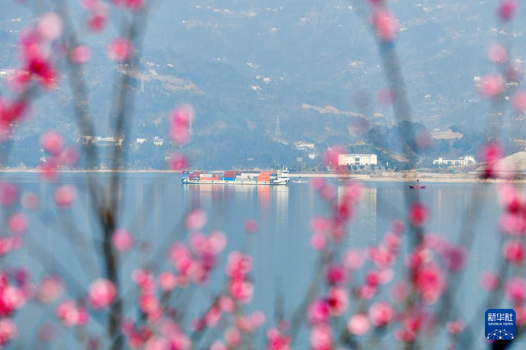 2026年1月11日,船舶行驶在三峡大坝附近的湖北省宜昌市夷陵区太平溪水域,岸边梅花绽放。