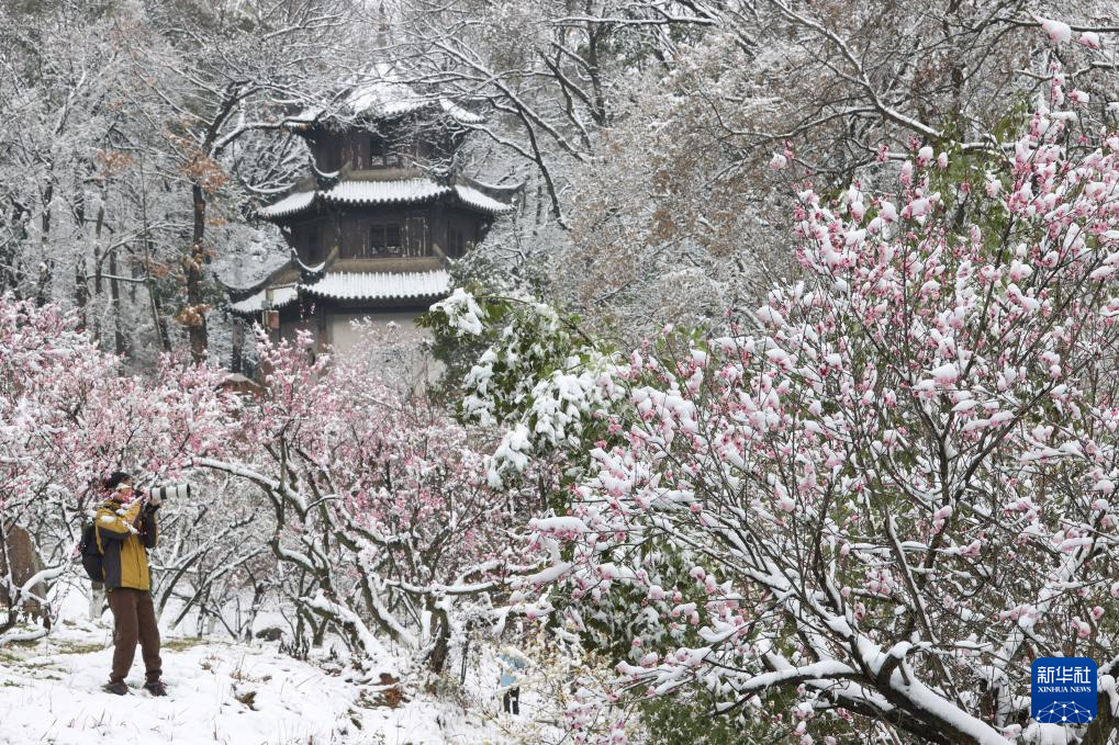 2026年1月1日,在湖北襄阳古隆中风景区,游客拍摄雪后梅花。