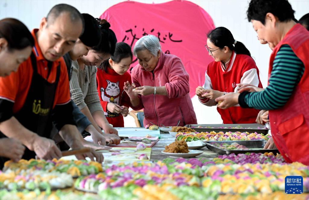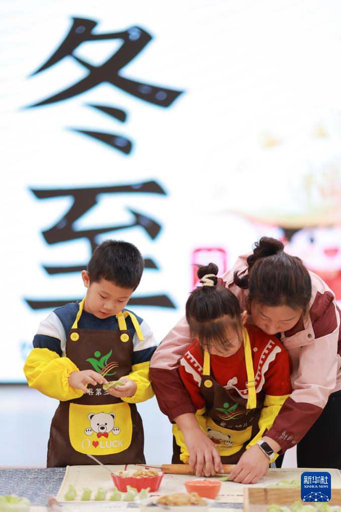2025年12月21日是冬至,在河北省石家庄市新华区一家养老公寓,社区志愿者与老人一起包饺子。