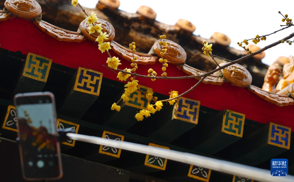 2026年1月5日,在河北省石家庄市鹿泉区十方院,游客用手机拍摄蜡梅。