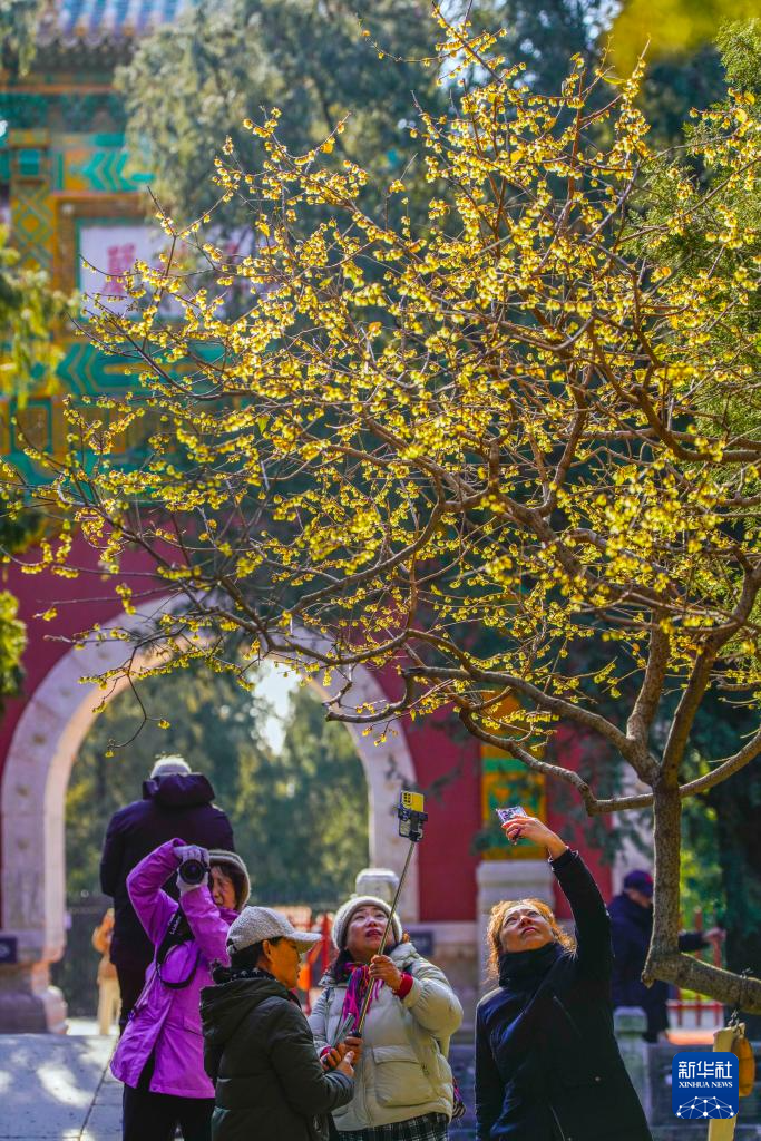 2026年1月8日,人们在北京国家植物园卧佛寺拍摄蜡梅。