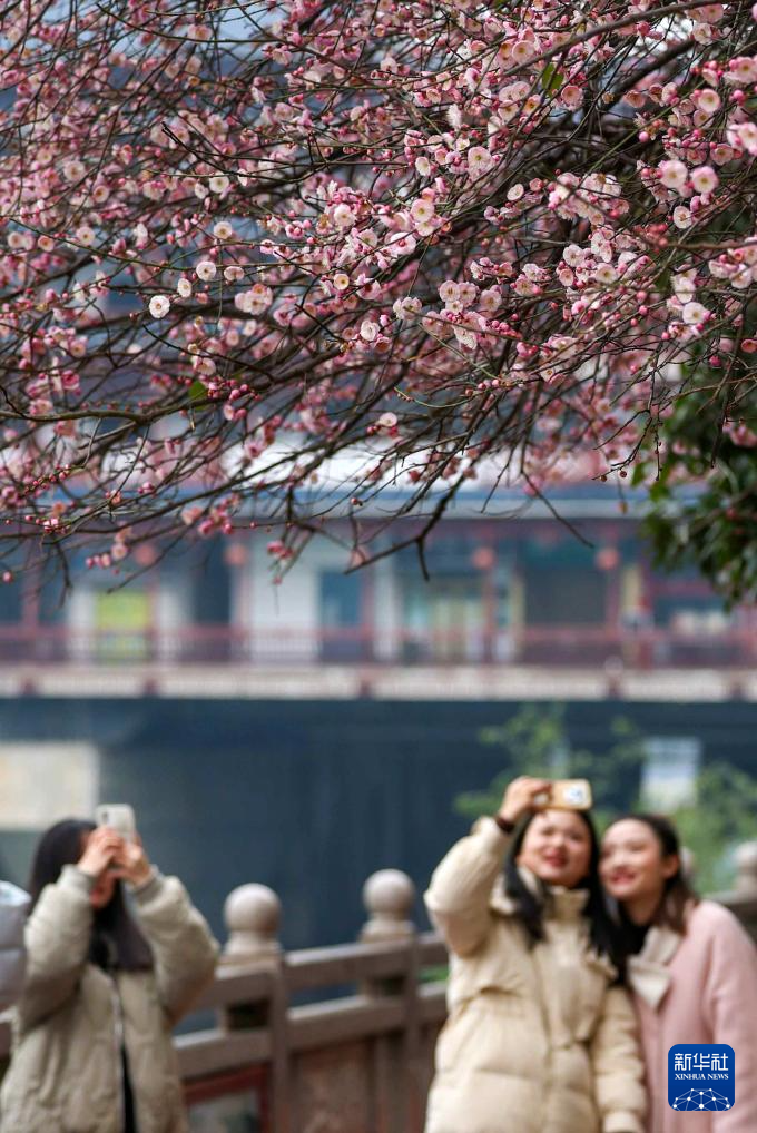 2026年1月5日,在贵州省铜仁市玉屏侗族自治县,人们拍摄绽放的梅花。