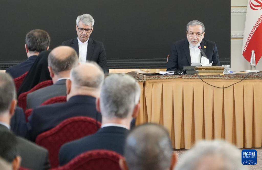 1月12日,伊朗外长阿拉格齐(右)在首都德黑兰出席外国使节会议。