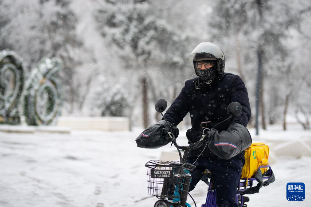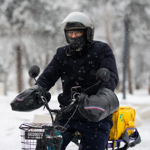 1月16日,一名外卖员骑车经过哈萨克斯坦阿拉木图的一条街道。