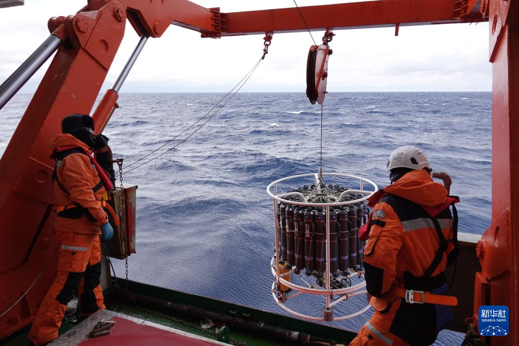 北京时间1月24日,“雪龙”号大洋队队员丁伟康(左)和宋熙存在舯部甲板开展本次考察阿蒙森海区域首次温盐深剖面观测和海水样品采集作业。