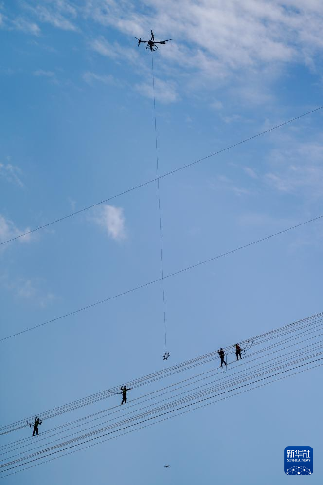 2月5日,施工人员在输电导线跨国连通处作业(无人机照片)。