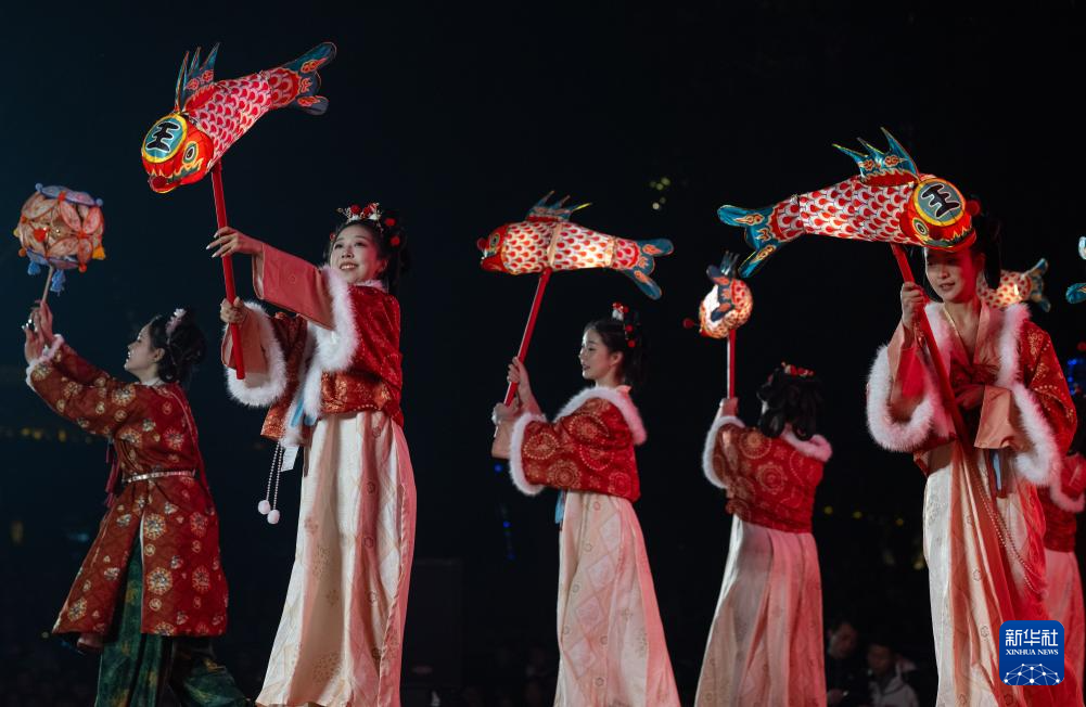 2月5日,在重庆市永川区兴龙湖公园,市民观看年货文化节开幕式节目表演。