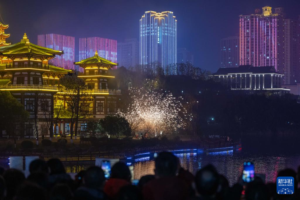 2月5日,在重庆市永川区兴龙湖公园,市民观看打铁花表演。