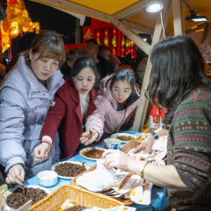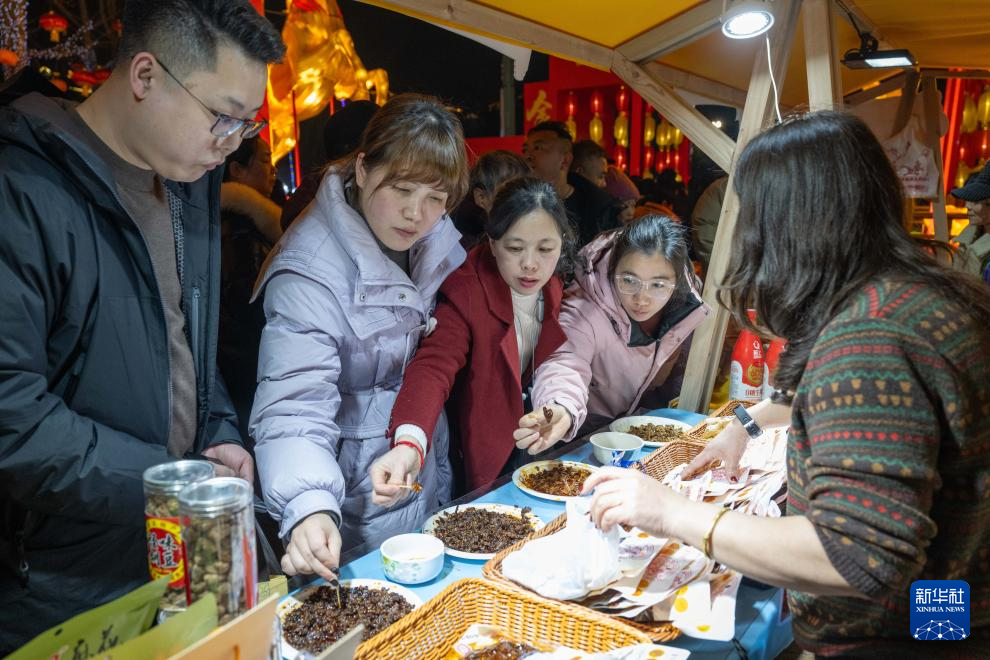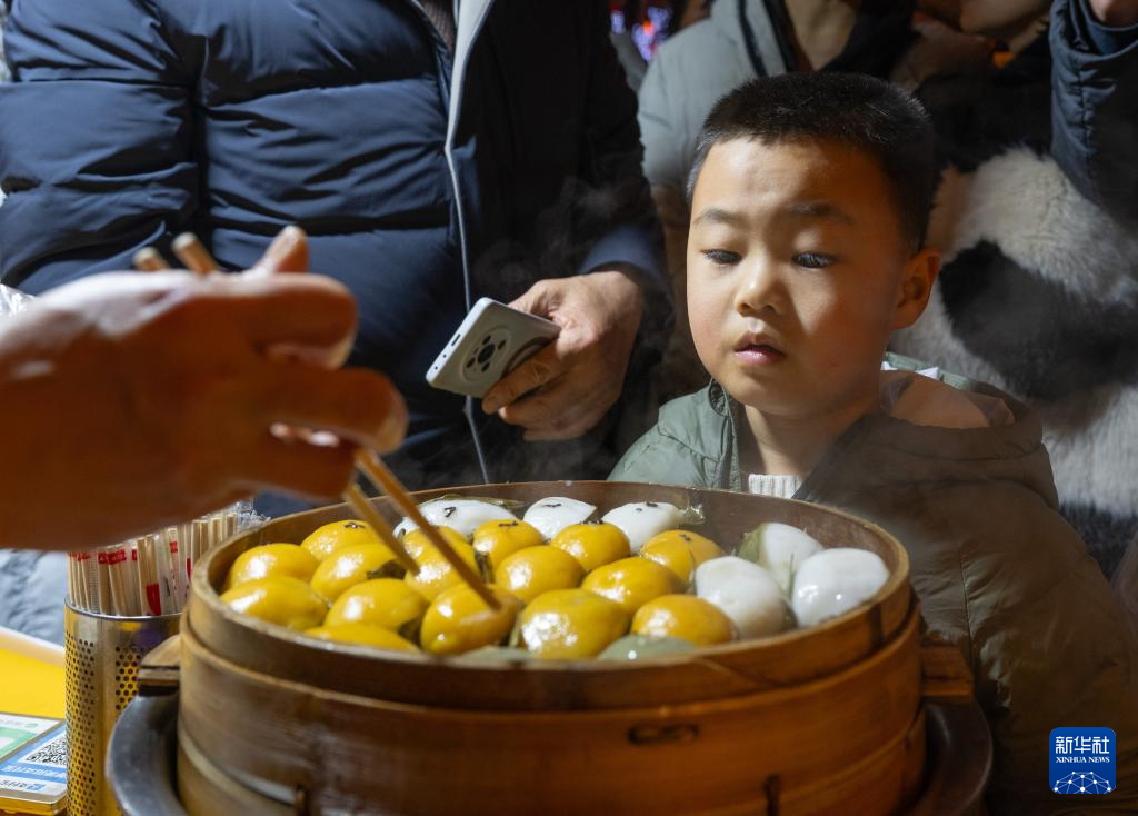 2月5日,在重庆市永川区兴龙湖公园,小朋友被售卖的年货小吃所吸引。