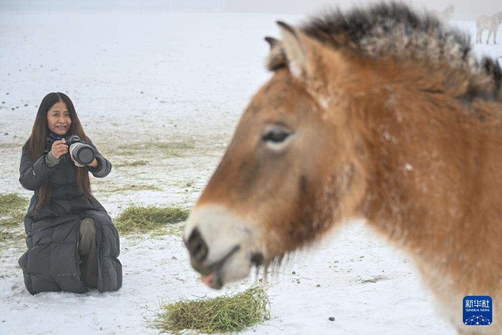 这是在新疆卡拉麦里山有蹄类野生动物自然保护区管理中心野马繁育研究所,科研人员为野马拍照存档(2月6日摄)。